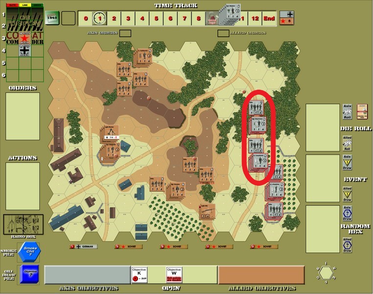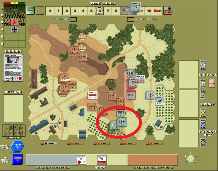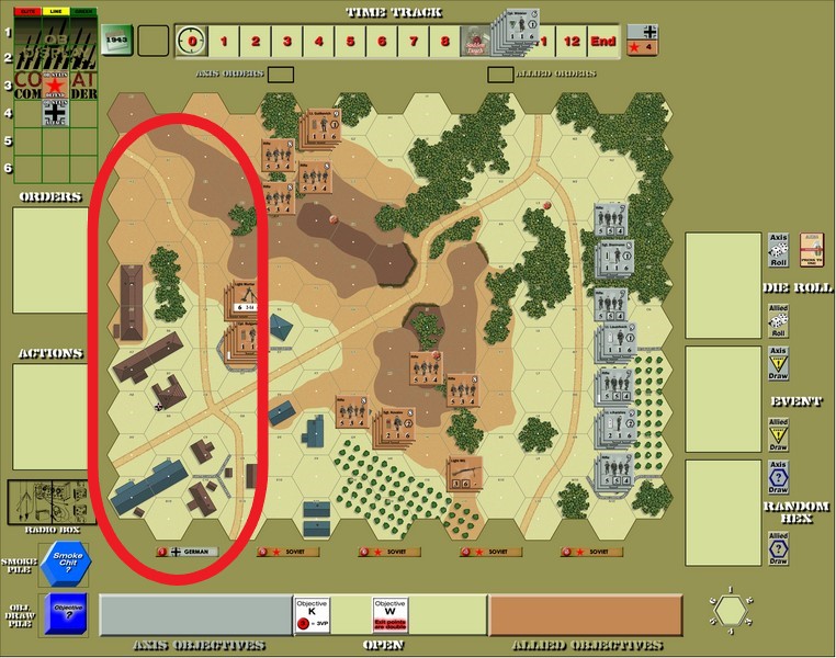 The area on the other side of the road, inside of the red oval, is the town. It’s impassable to Soviet units.