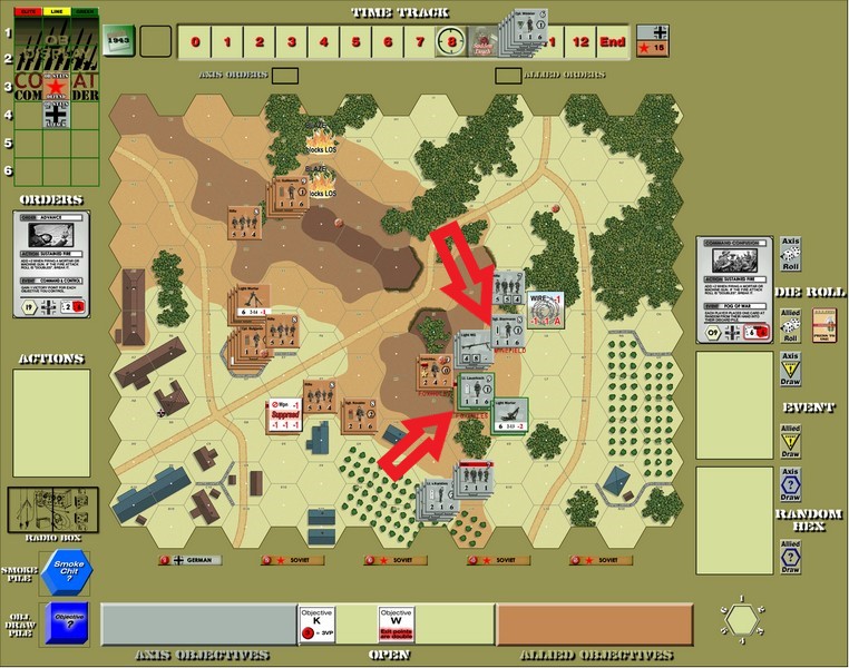 Lt. Lauerbach decided to take advantage of a German sniper breaking the Soviet squad in the foxholes and advanced into their hex. On the same move, Biermann’s men (without Biermann, who can’t be activated by Lauerbach) Advanced out of the minefield.