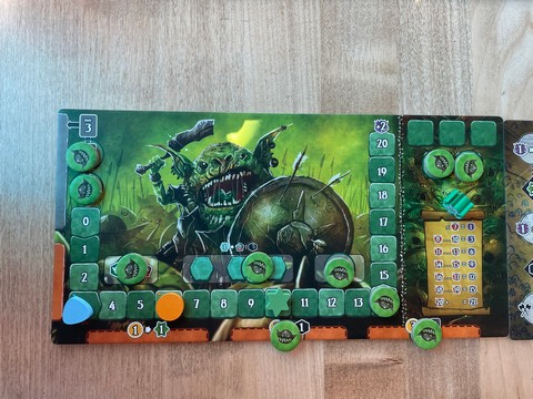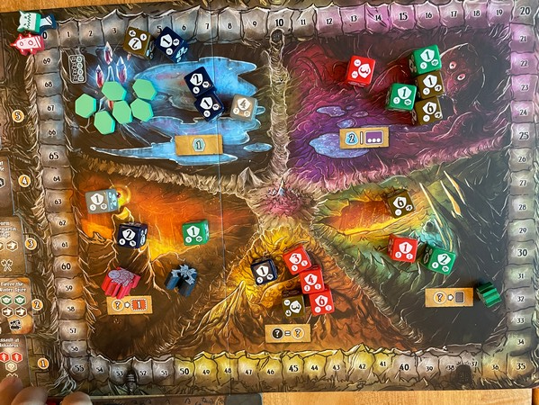The main board is laid out and has five shrines where dice will be drawn from the bag and placed in them. There are five different colours of dice, and these represent troops for each monster type.