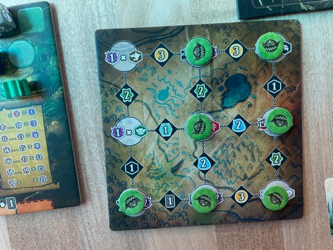 The player board has a track for Magic, Gold, and Influence, and a bunch of player discs that they will be trying to move off the board to free up some cool stuff.