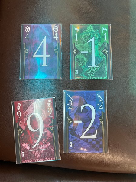 All cards of the same number cancel each other out (thus the two 7s above) and the highest number of the emperor’s colour (blue, yellow, red) that is still next to it after that is the winner. That player keeps the emperor and will score it at the end of the game.