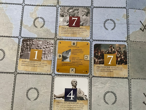 The game lasts 3 rounds, and each round 13 Emperor cards are placed out on the board.