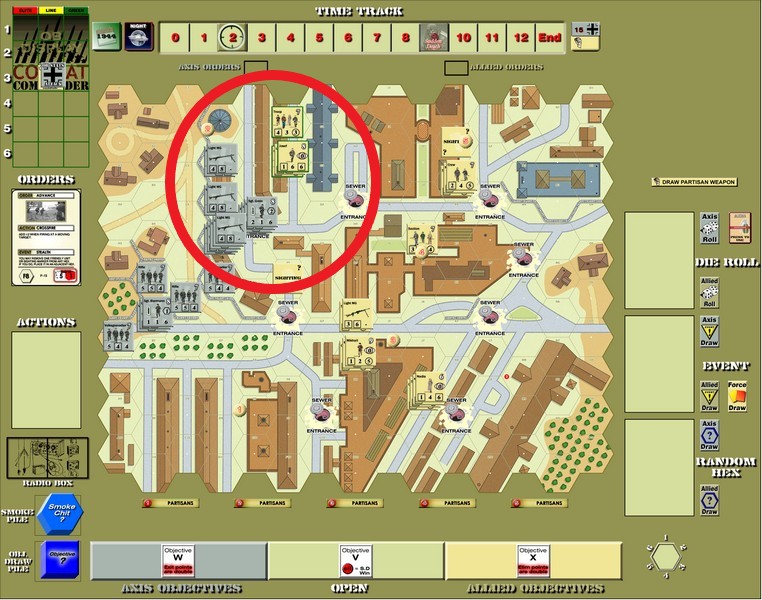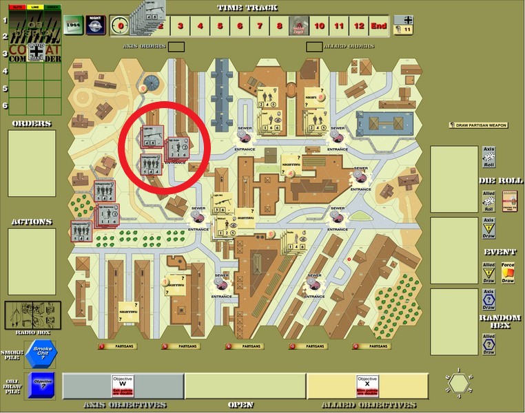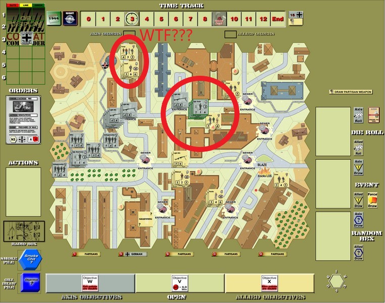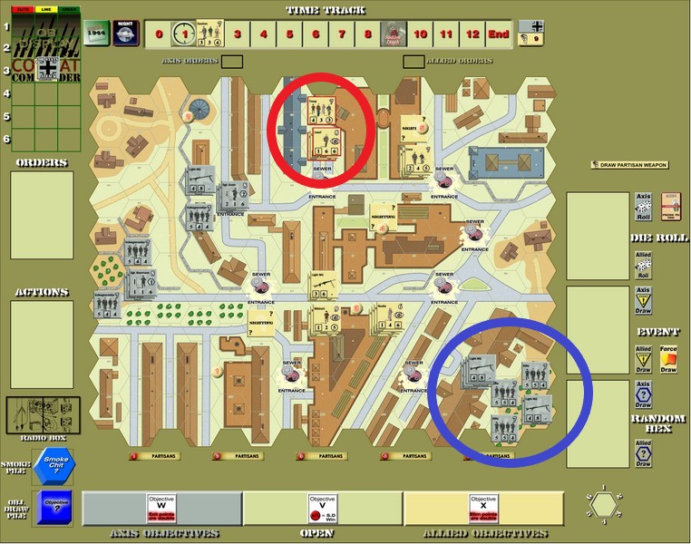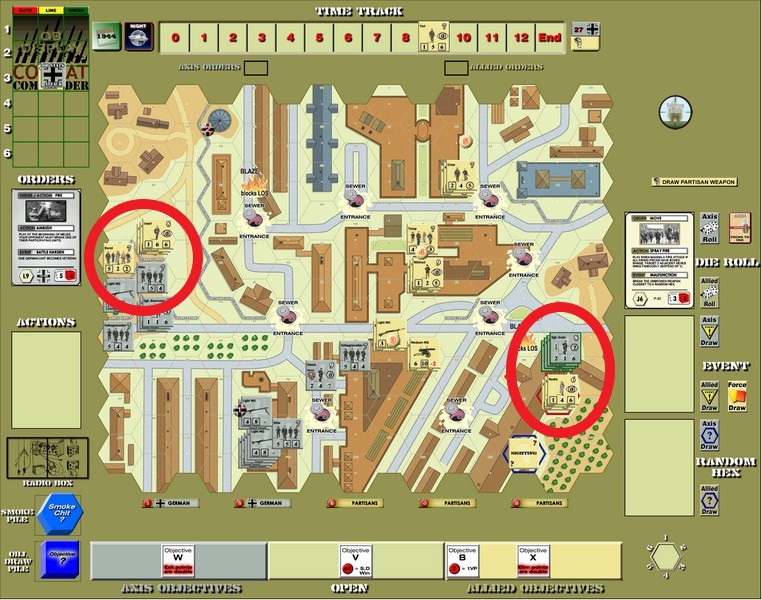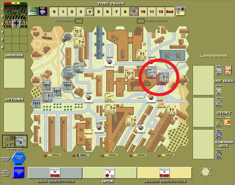 This is also when I realized that the two Partisan units in the building at the top by the Sewer Entrance didn’t actually have a leader that could activate them both…and didn’t even before I moved Josef since Josef couldn’t see them!