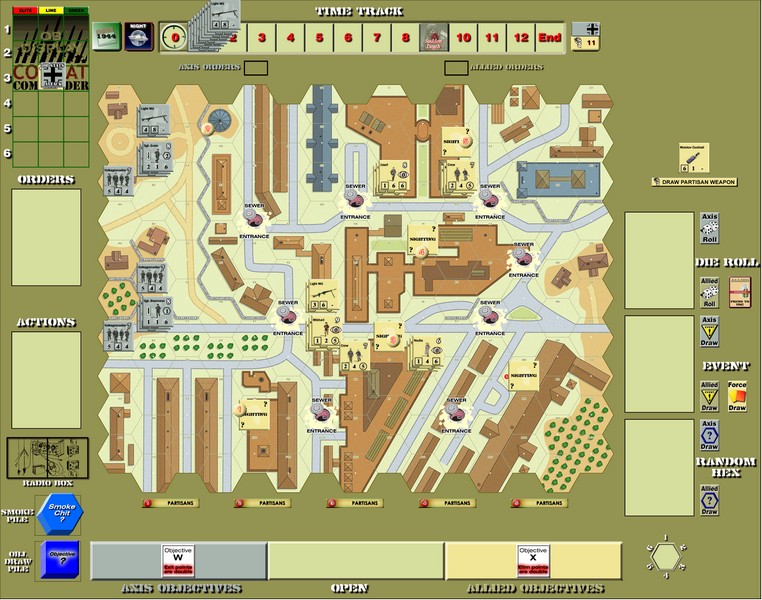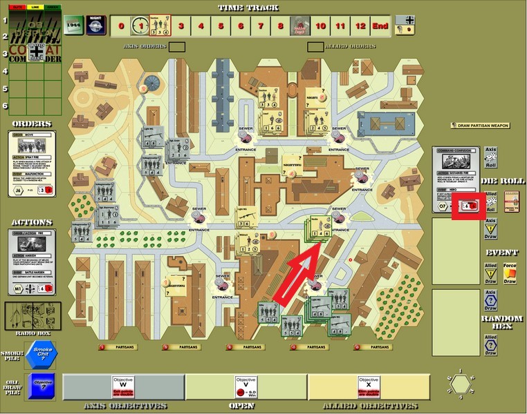 On a Partisan die roll, a sniper had broken Sgt. Biermann on the heights above the city on the left side of the board.