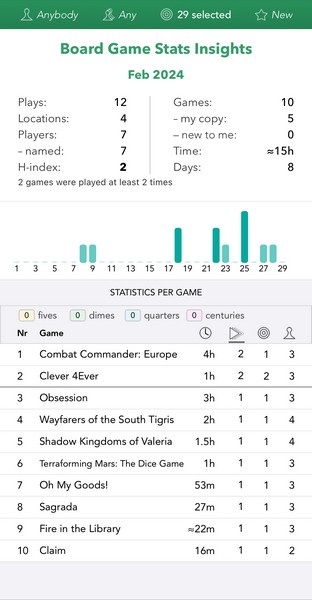 Many thanks to the wonderful BG Stats app for these pictures and just the ability to track all of our games played!