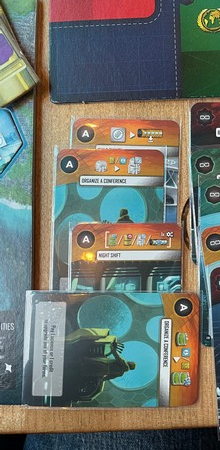 For example, the green Negotiation Team will let you play a card instead of discarding it when you take the “Always Available” action slot (which has you discard a card to draw 2 cards and get 2 credits).