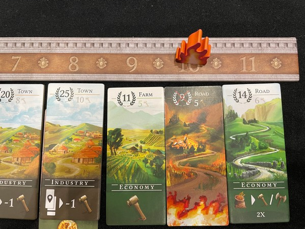 The disaster mechanism is the beauty of this game, though. Using the No Thanks method of “bid something to avoid taking the card”, players will bid resource to pass it along to the next player.