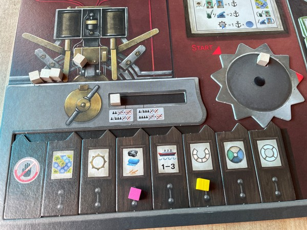 On your turn, you will be picking up your cube from the action it’s on, moving it to the front of the action row (which will also move the timer gear one space) and then choosing another action to do.