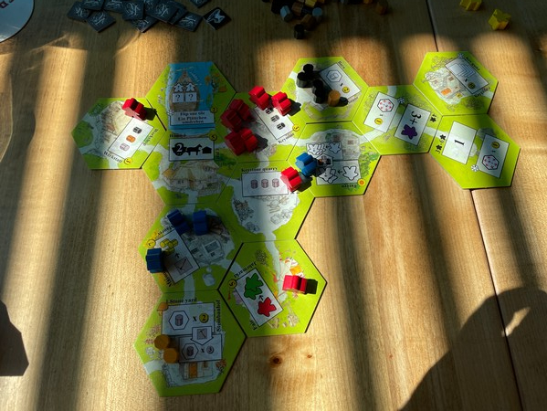 The fun part about this is that there are three different meeple colours: yellow, blue and red.