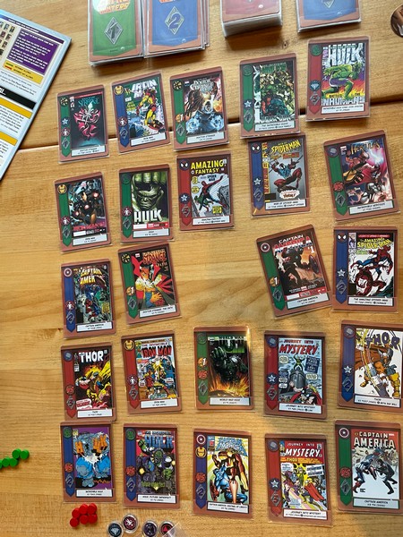 In the game, players are trying to amass the best Marvel Comics collection that they can, bringing in heroes such as Captain America, Thor, Dr. Strange, Spider-Man…all of the good ones!