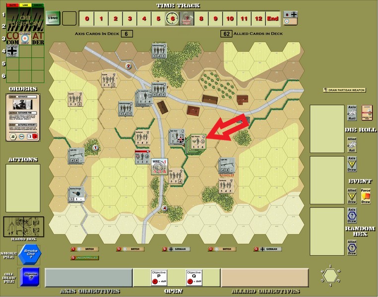 For my second Advance, I thought about going directly into Ganz’s hex, but realized that it wouldn’t take the objective (I’d need to eliminate the squad too) and that it would basically be a toss-up without an Ambush (and I was worried Bob had one).