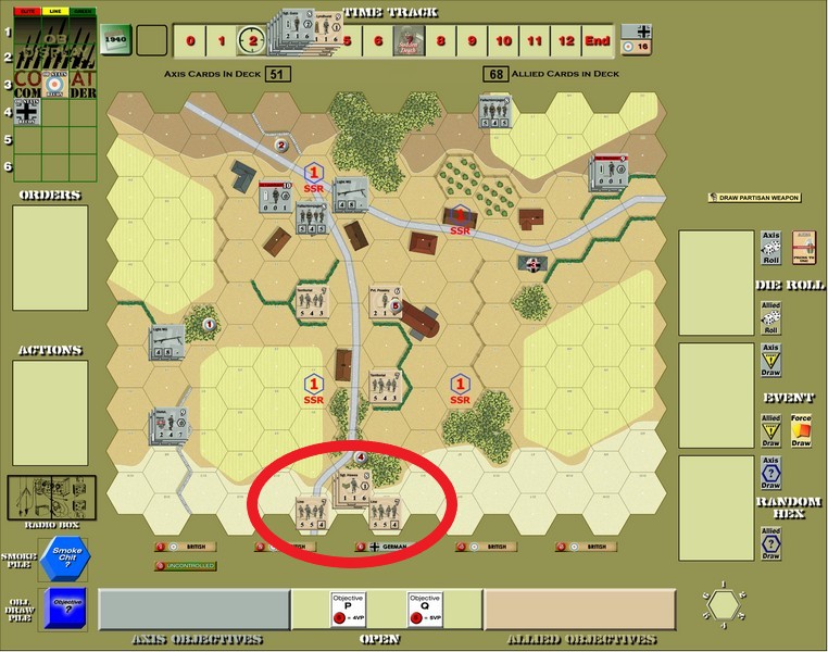 Lauerbach continued moving around the perimeter, taking Peasley’s fire and not having anything happen (except some British Air Support, which broke the guys in the south, though on the next German morale check, the German Hero Dietel emerged, rallying them immediately).