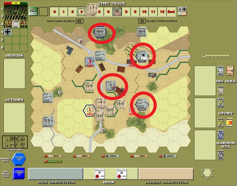 See all of those SSR1 markers? The British (tan – me) have to set up within that box, with Peasley having to set up in that one specific hex.
