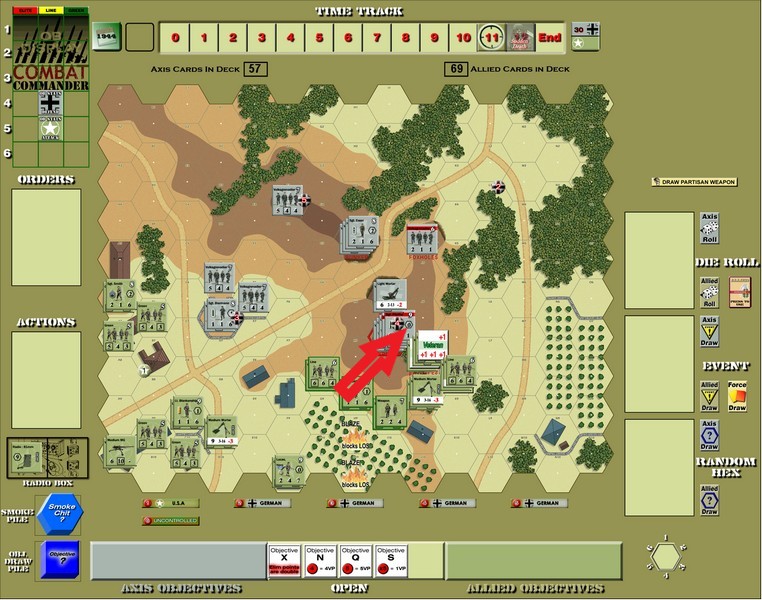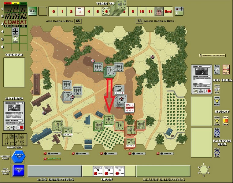 The German mortar firing brought on another German Time trigger, but I had the Initiative so I quickly nixed that.