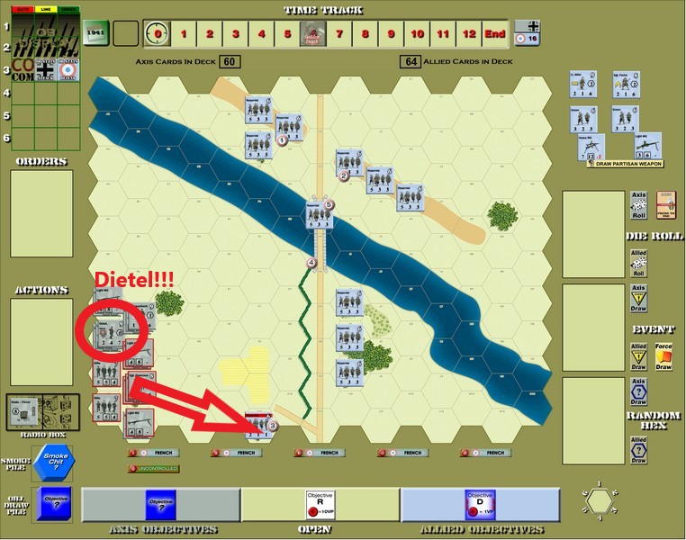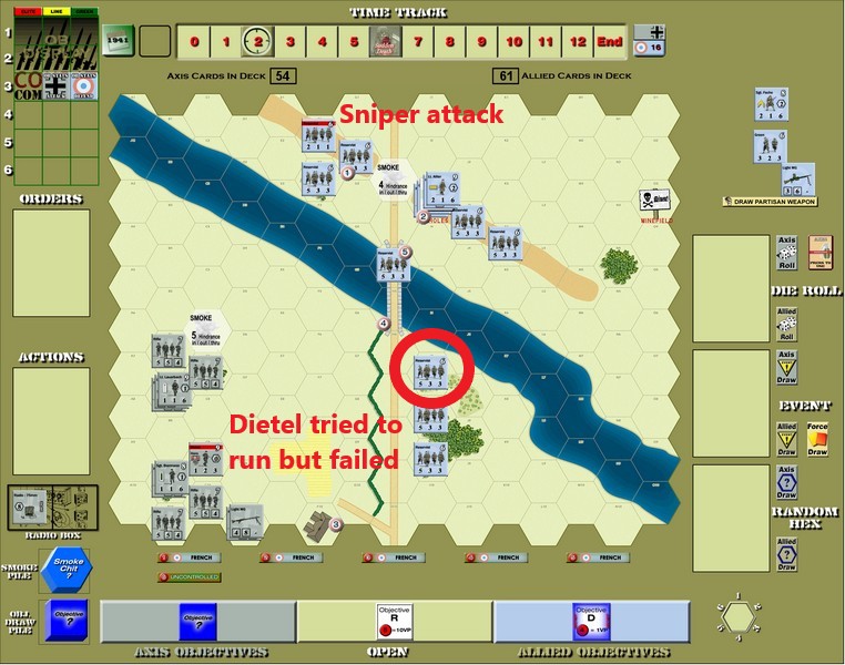 Some Yugoslav fire on Dietel to try and get him out of there brought the Yugoslav Hero onto the board! Reinforcing the squad on the bridge.
