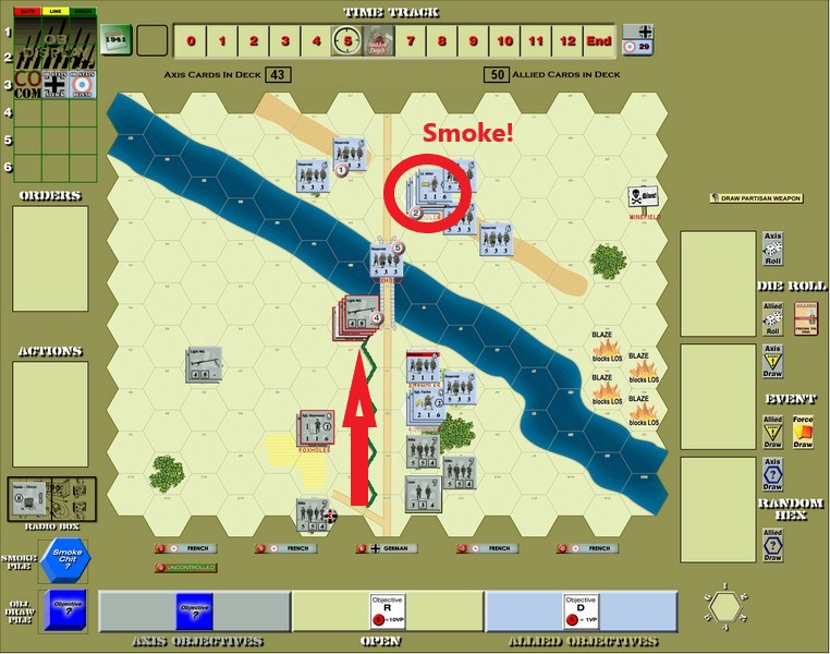 Then he tried again, targeting the Yugoslav squad on the bridge (shorter distance, easier to hit) and promptly missed. The smoke drifted back onto the broken Yugoslav unit (though sadly smoke does not help with Recover attempts).