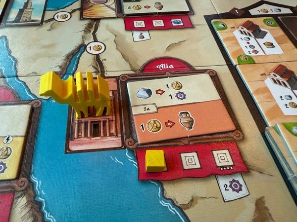 Once per city, you can also establish a trading base there, which will give you another bonus and work towards endgame scoring.
