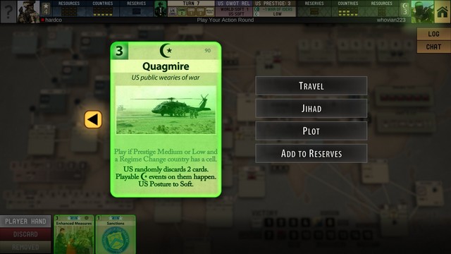 In the game, players are either the US or Jihadist extremists, trying to exert their influence and get various countries on their side (or under Islamic Rule if you are the Jihadists).